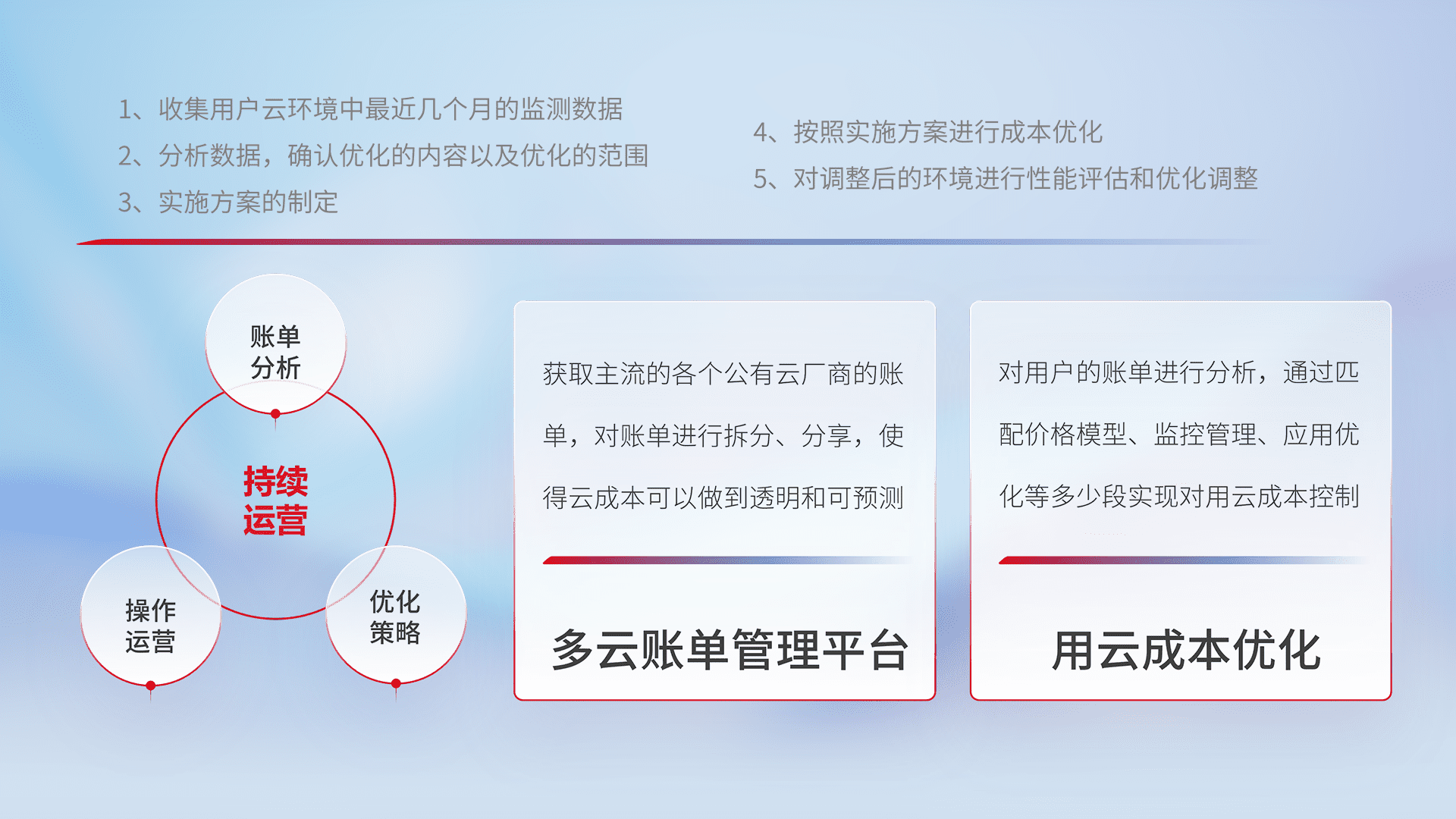 通过多云纳管,,,,以统一的资源数据模型把客户的云资源进行抽象和封装,,,,进而实现对多云资源的统一操作,,保障云资源管理的可靠性、、、、稳定性与可用性。。量身定制化运维内容,,配置、、、开发运维、、补丁管理、、备份、、、、监控、、、认证和访问管理、、、、审计和日常巡检等,,,保障在用云过程中的可靠度,,,,稳定度以及高可用率。。。。